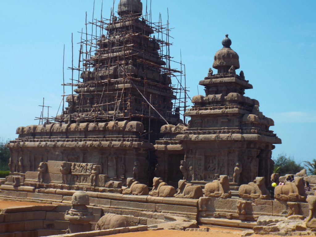 Mahabalipuram (ou Mamallapuram) est une ville-musée à ciel ouvert que l’on qualifie de berceau de l’architecture. Face au bord de mer, le temple du Rivage résiste depuis le 7ème siècle. A quelques centaines de mètre de là, se dresse « la descente du Gange », le plus grand “bas-relief” du monde.Et à quelques minutes de marches, légèrement excentrés, se trouvent “les cinq Rathas” qui sont des sanctuaires en forme de chariots taillés dans des pierres monolithiques. Ils furent une source d’inspiration pour de nombreux temples du sud de l’Inde.